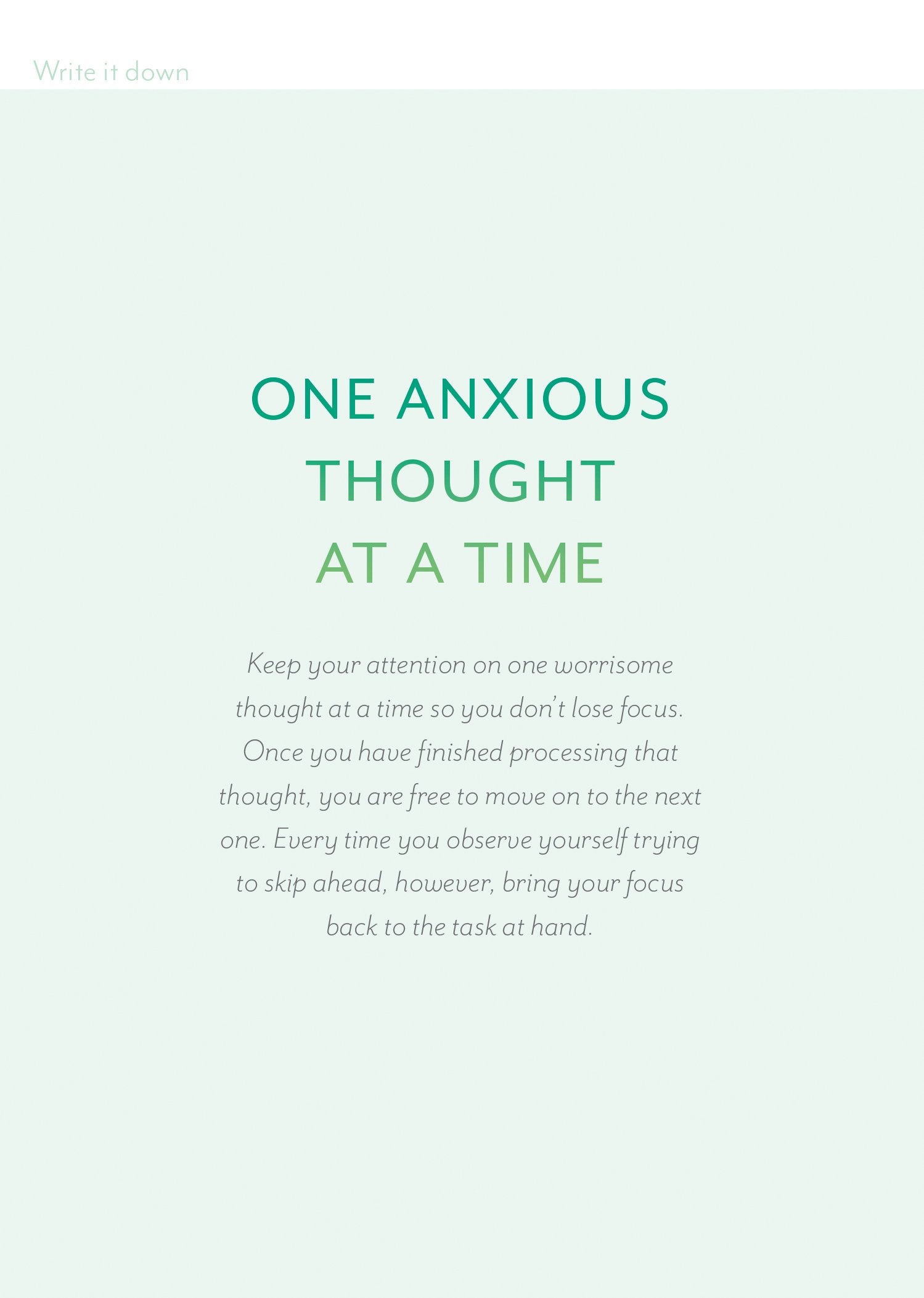 Writing down worries is a recognized therapeutic technique for relieving stress and anxiety. This inviting journal encourages users to record worries on one page ("write it down") and then use the opposite page to reframe anxious thoughts into positive actions or feelings ("let it go").