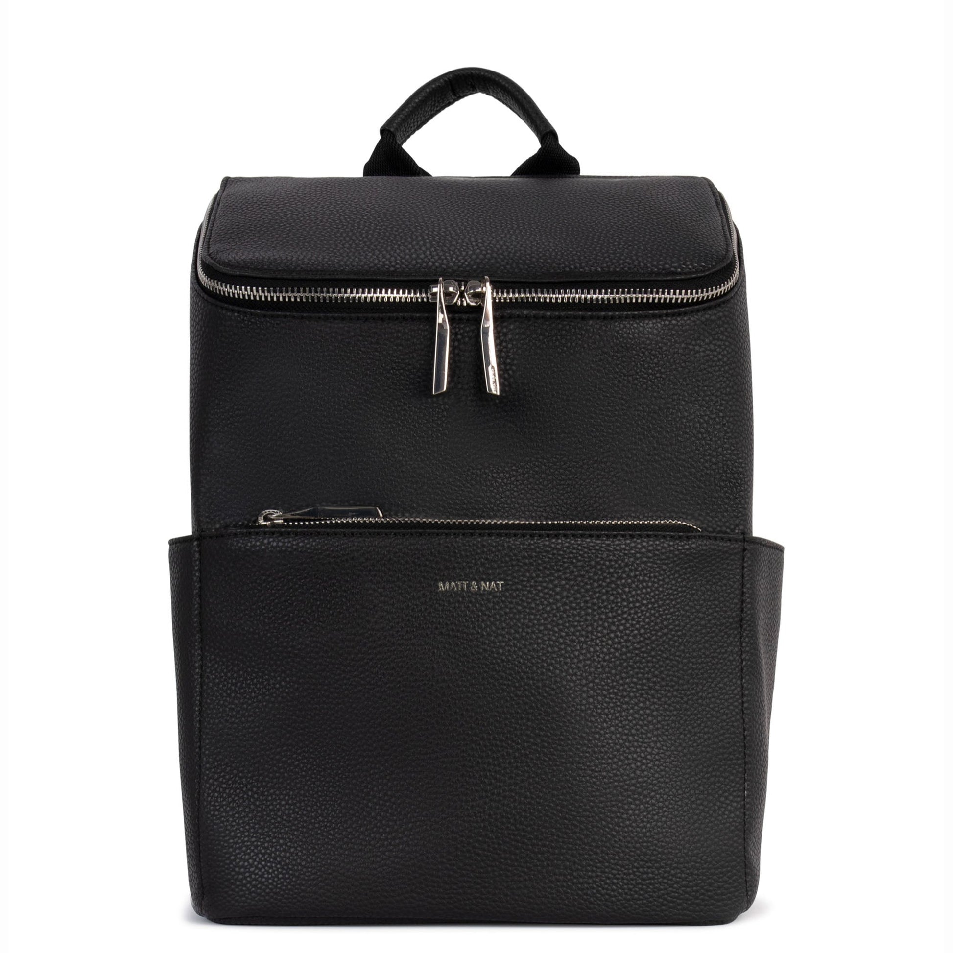 Backpack with top zupper closure. Adjustable webbing straps. Side pockets and front zipper pocket. Fits a 13” laptop.
