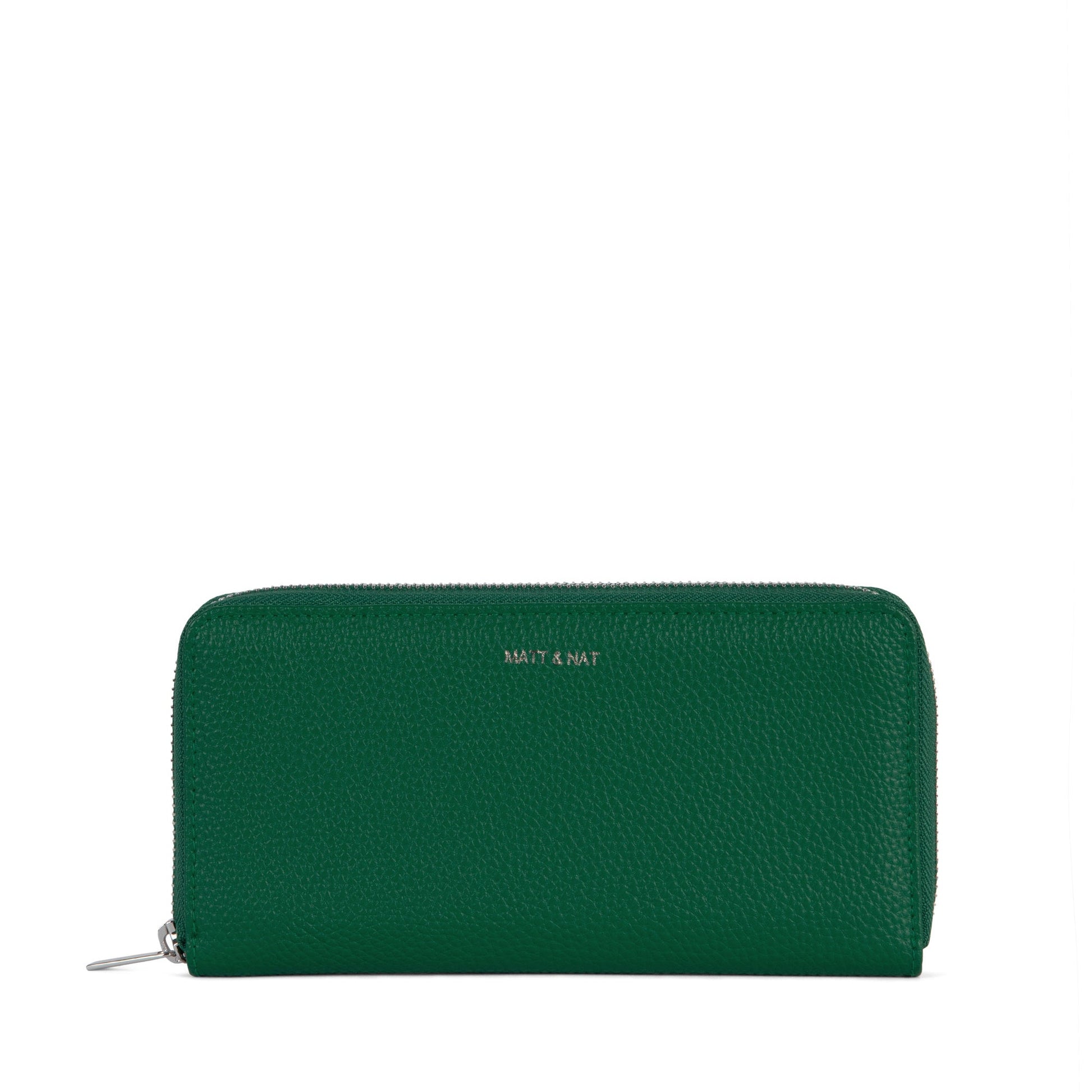 - Interior: 14 card slots, 2 bill compartments, zipper coin pocket.