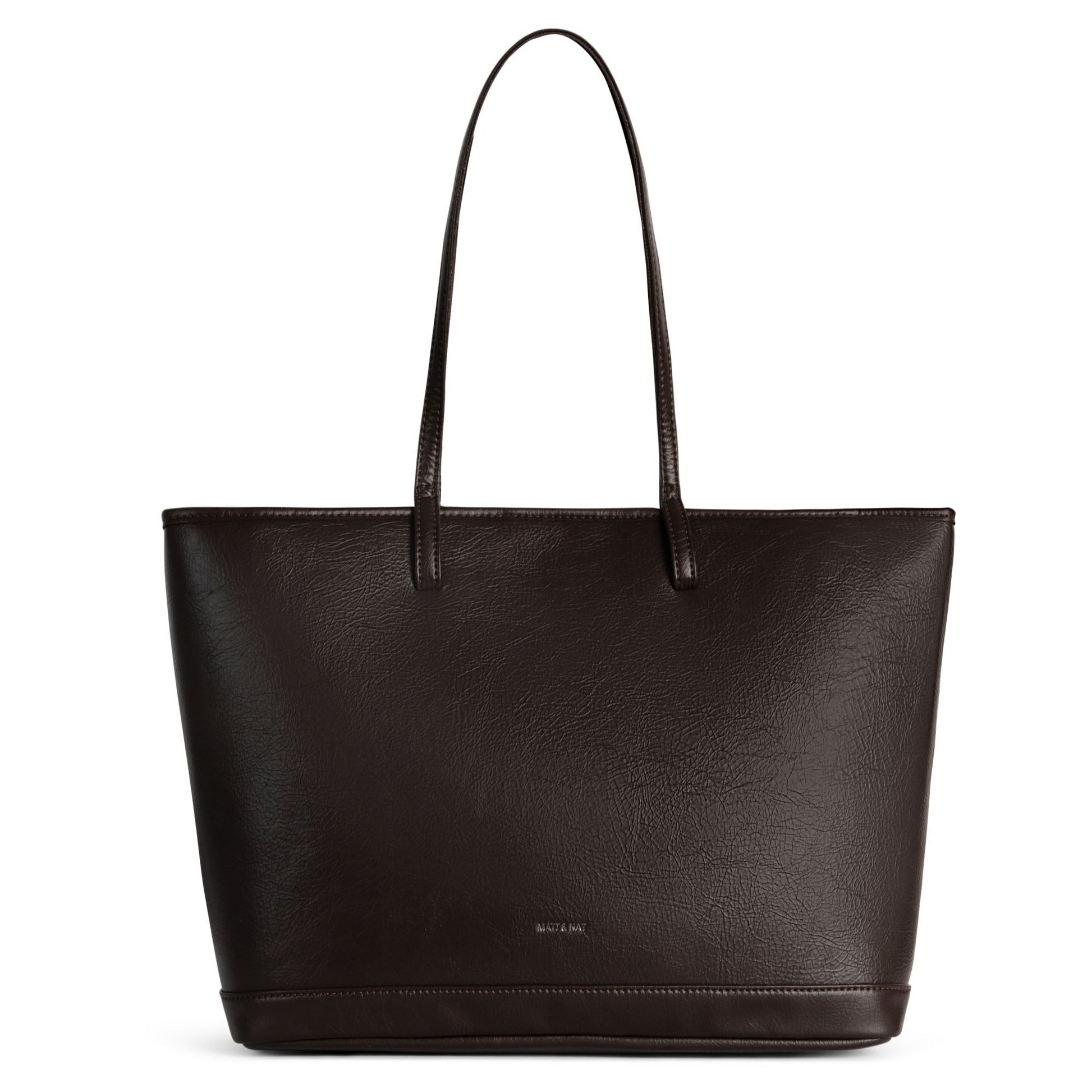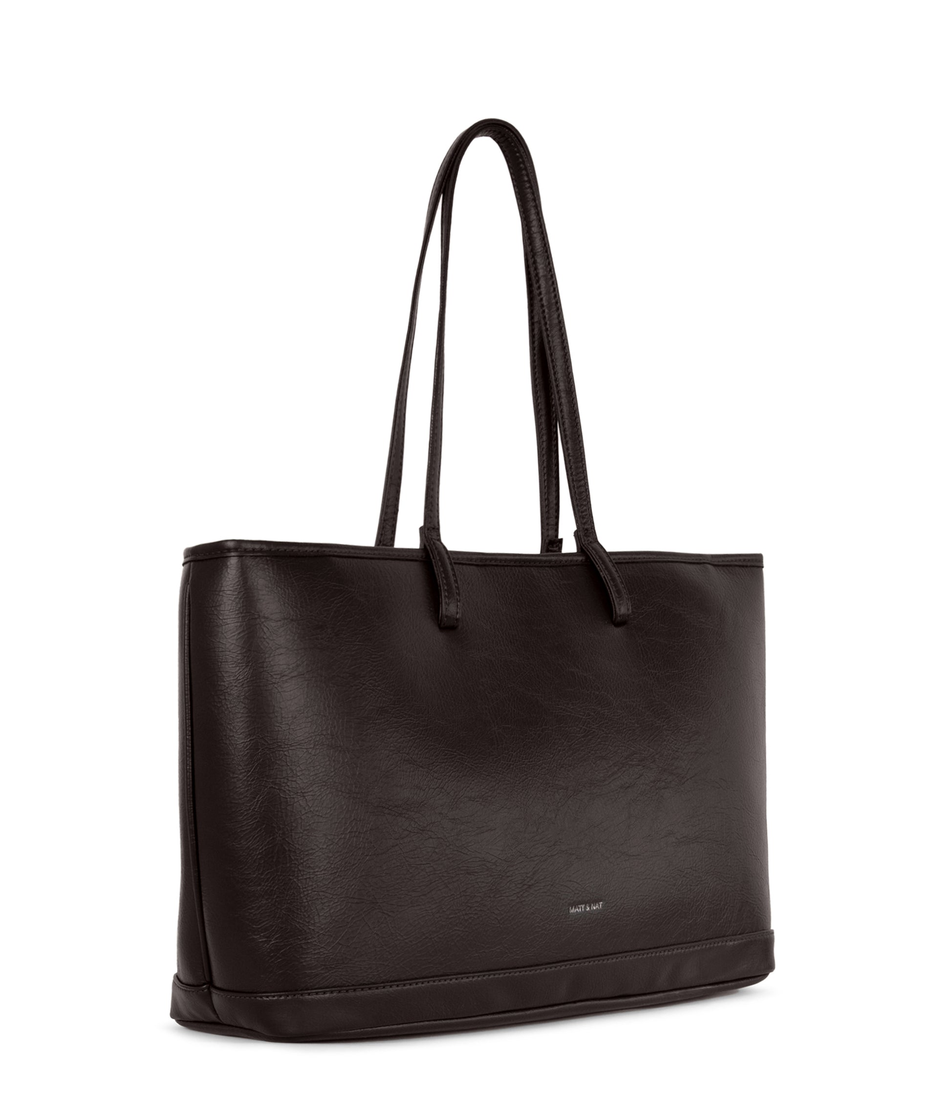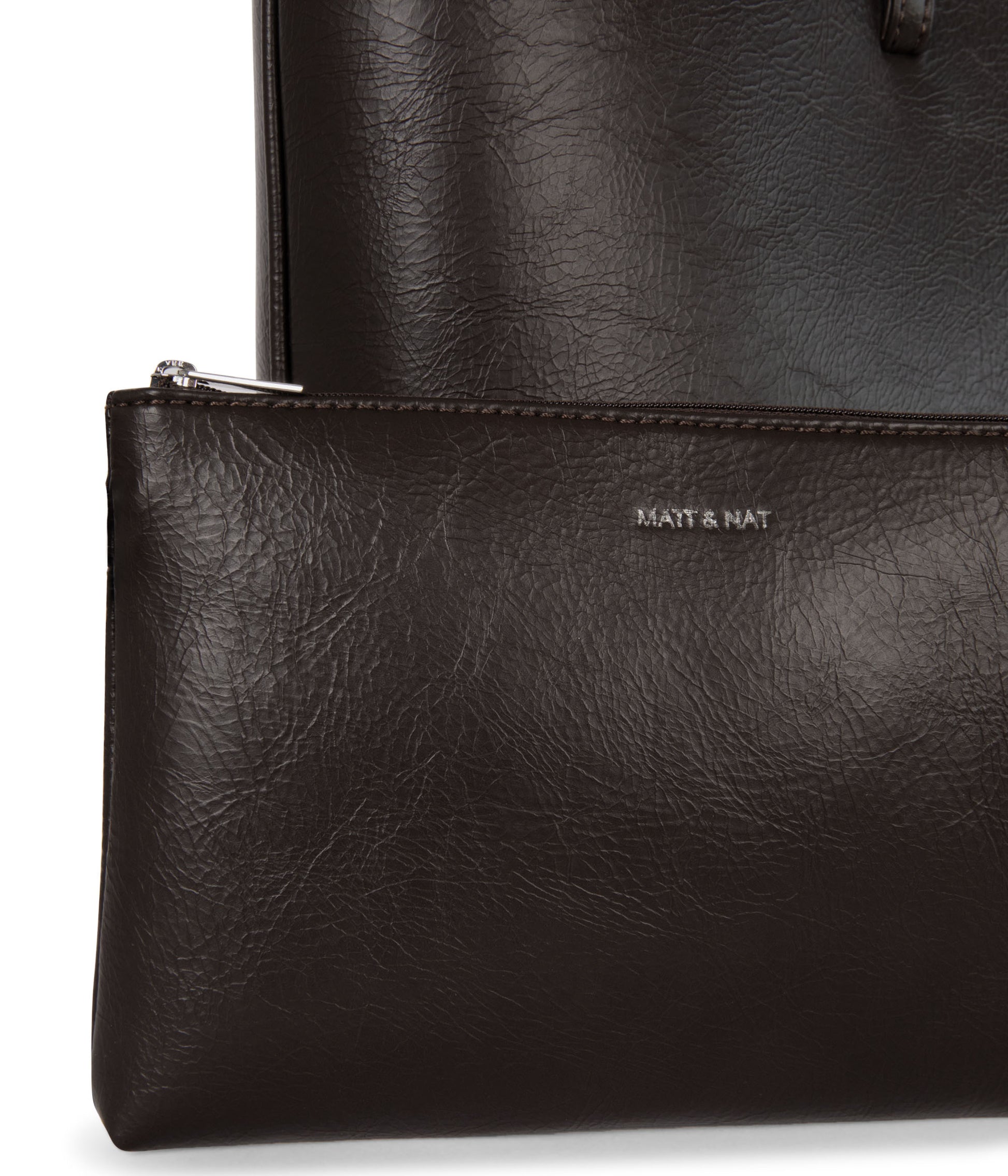 Tote with a magnetic snap closure and a removable zippered pouch inside.