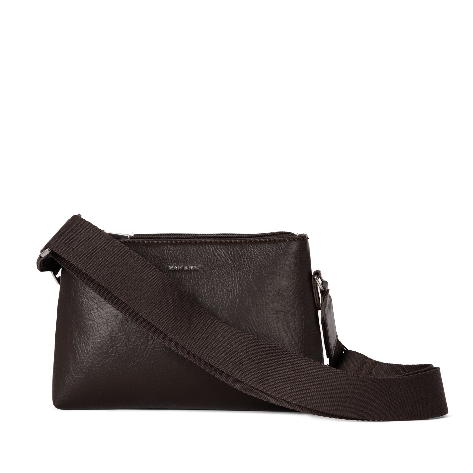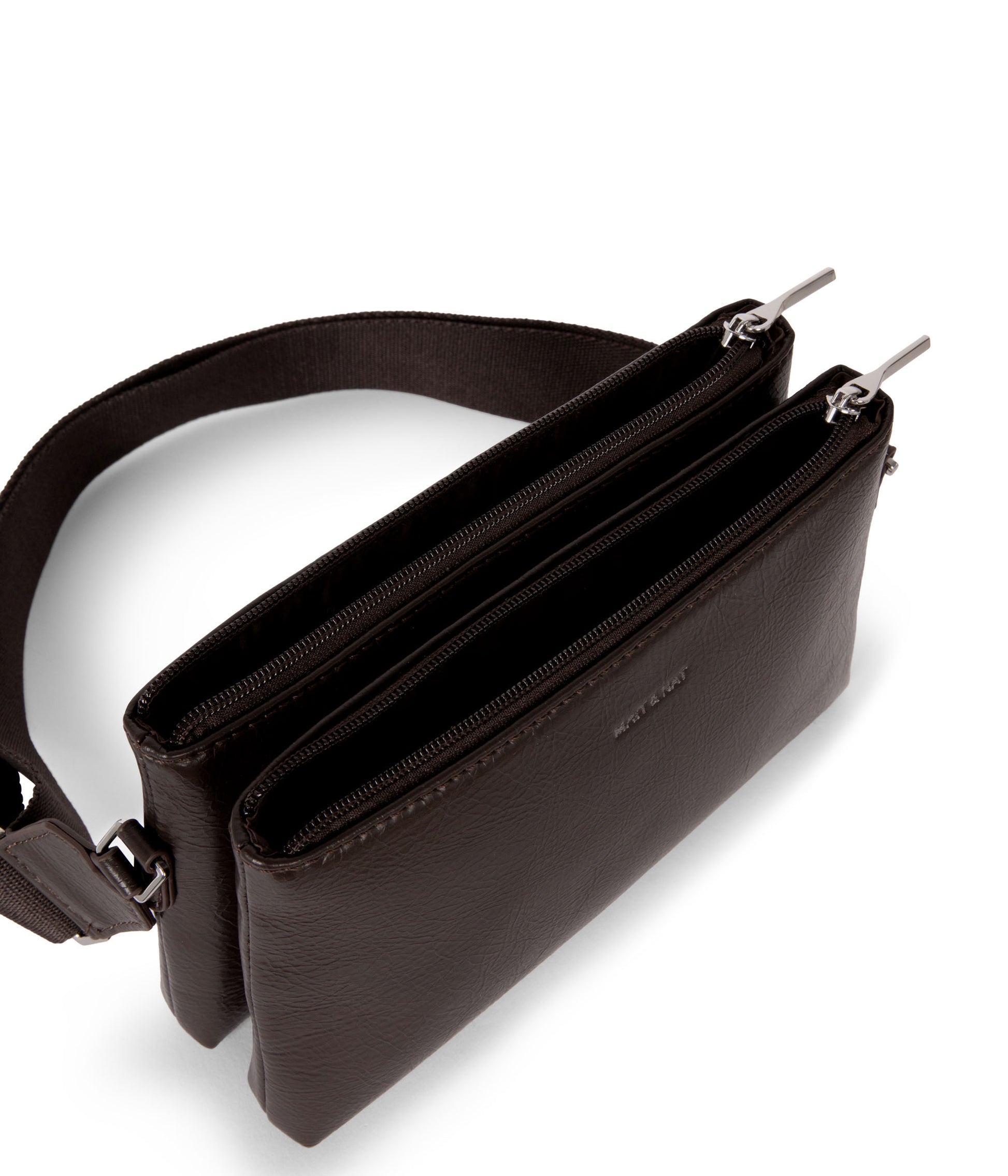 A double-compartment bag with zippered closures, a patch pocket at exterior back which can hold a large smartphone, 6 credit card slots at interior, and an adjustable strap.