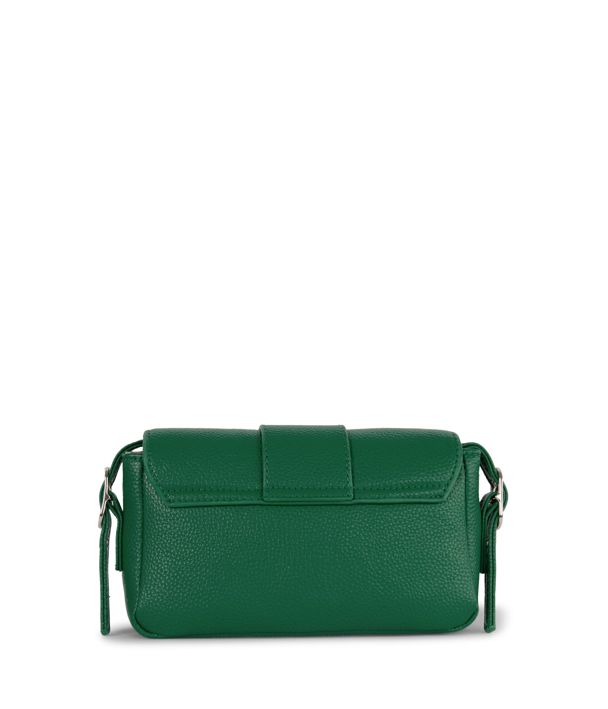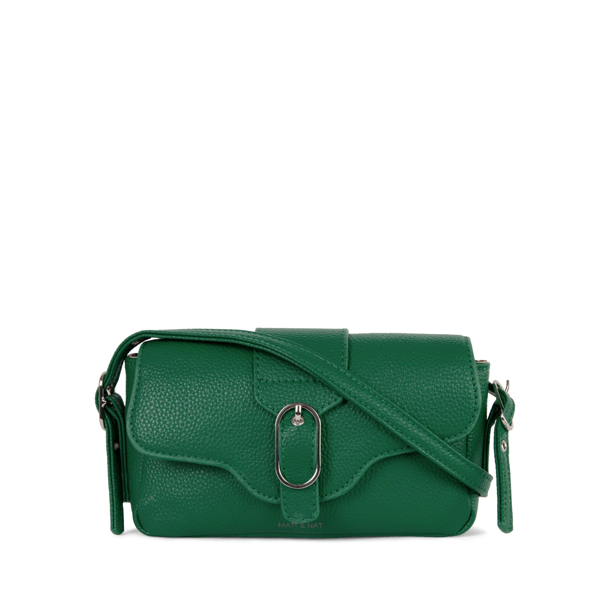 Slim crossbody bag with a top zipper closure, a front pocket with snap closure, and an adjustable strap.