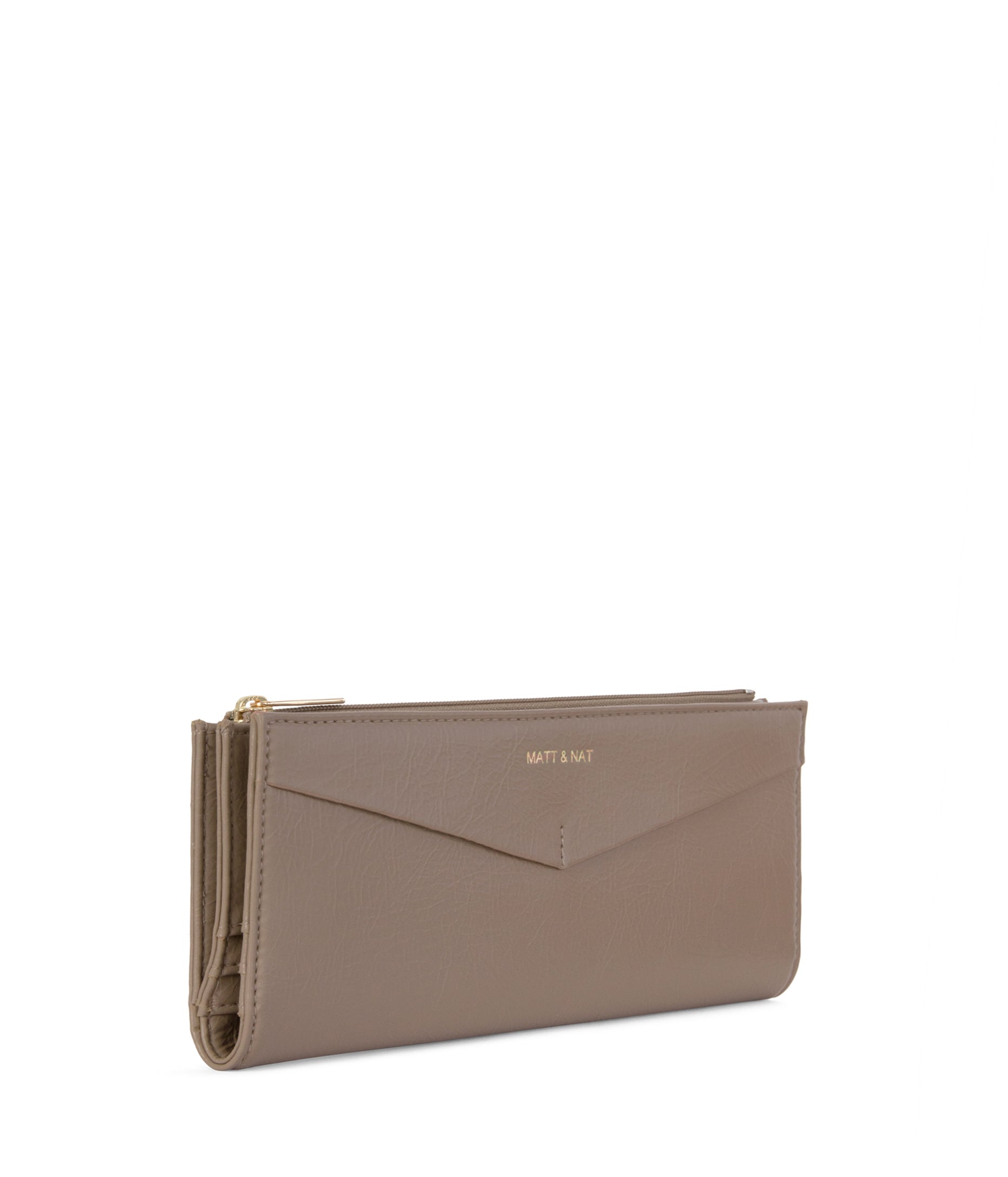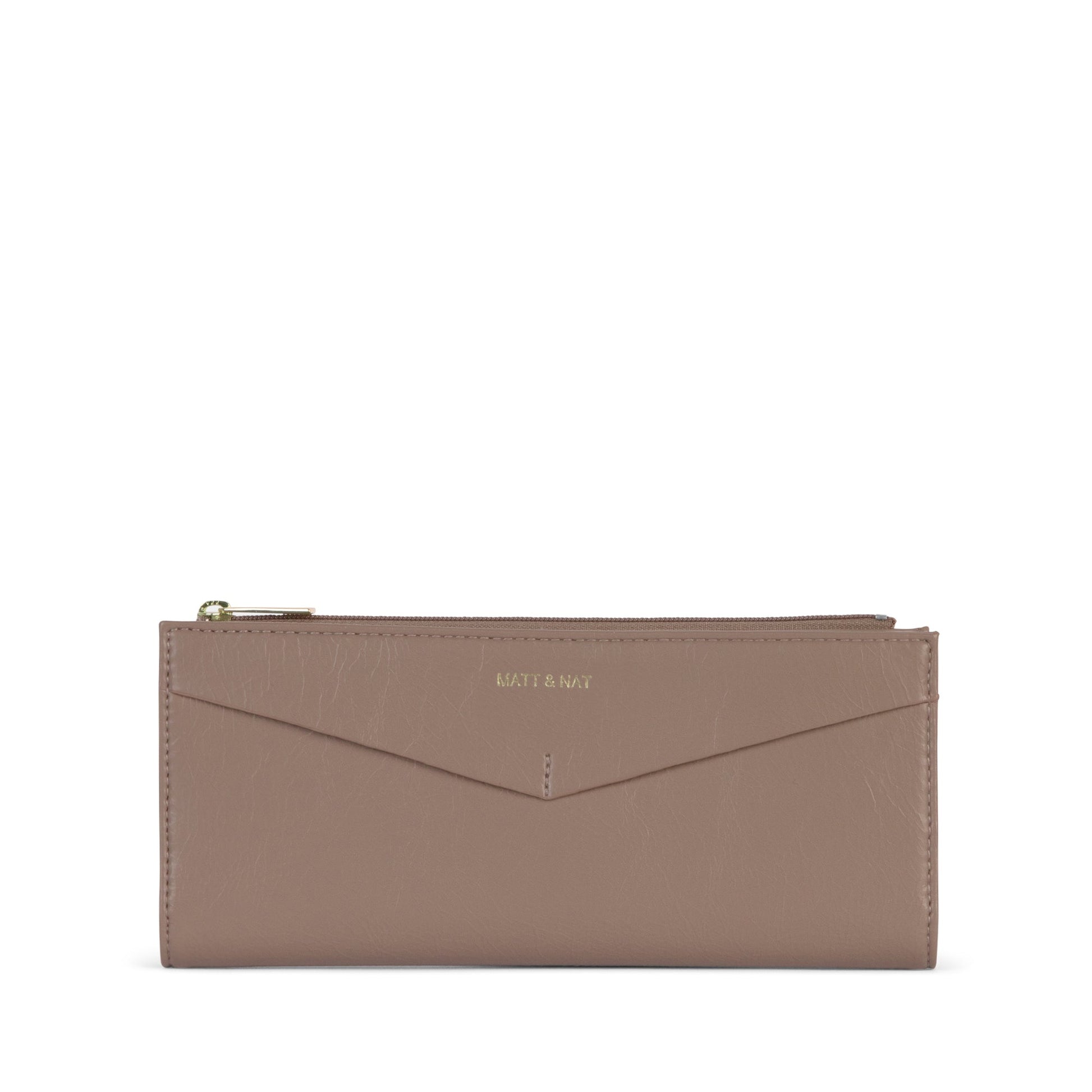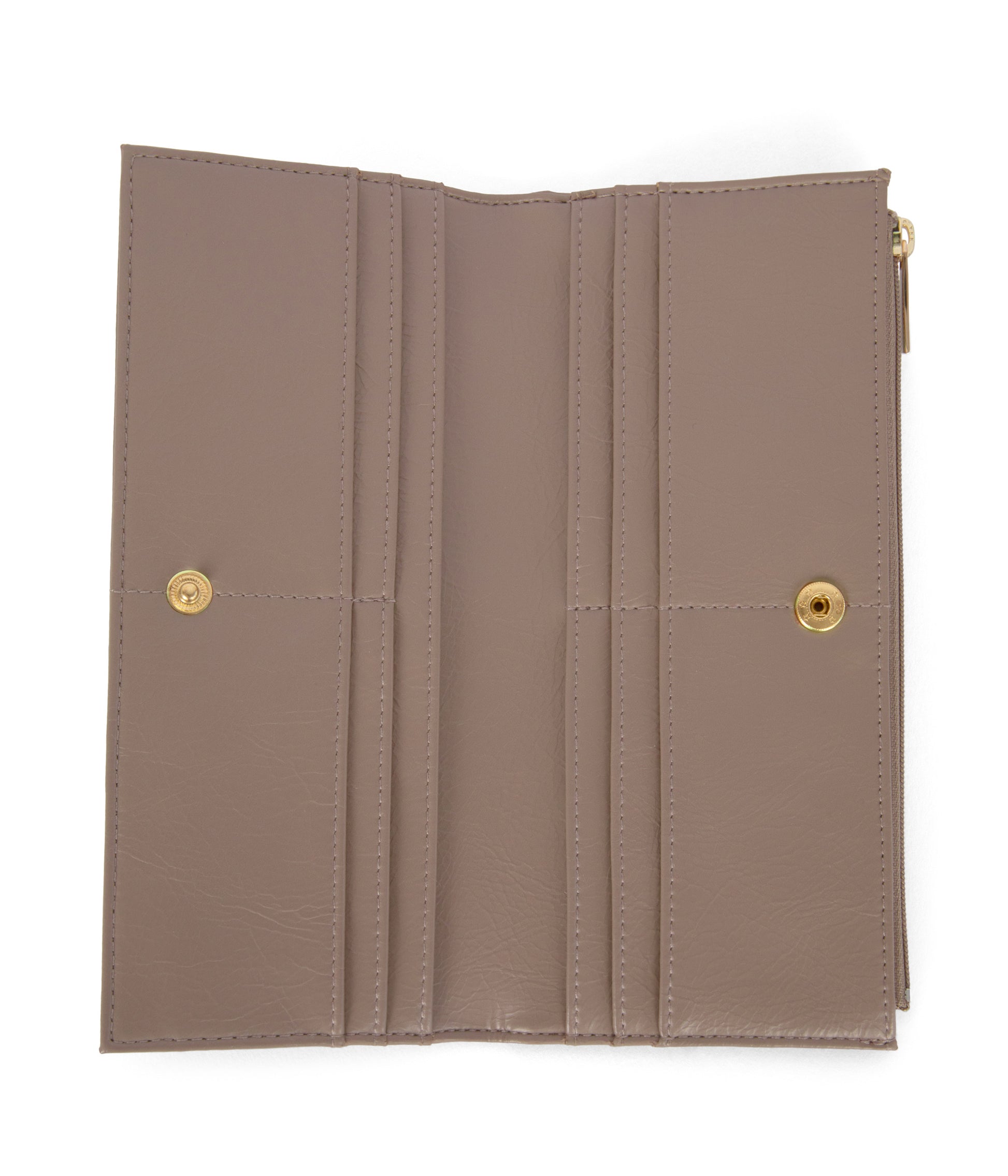 Folded wallet with snap closure, zippered coin pocket, and card slots inside.