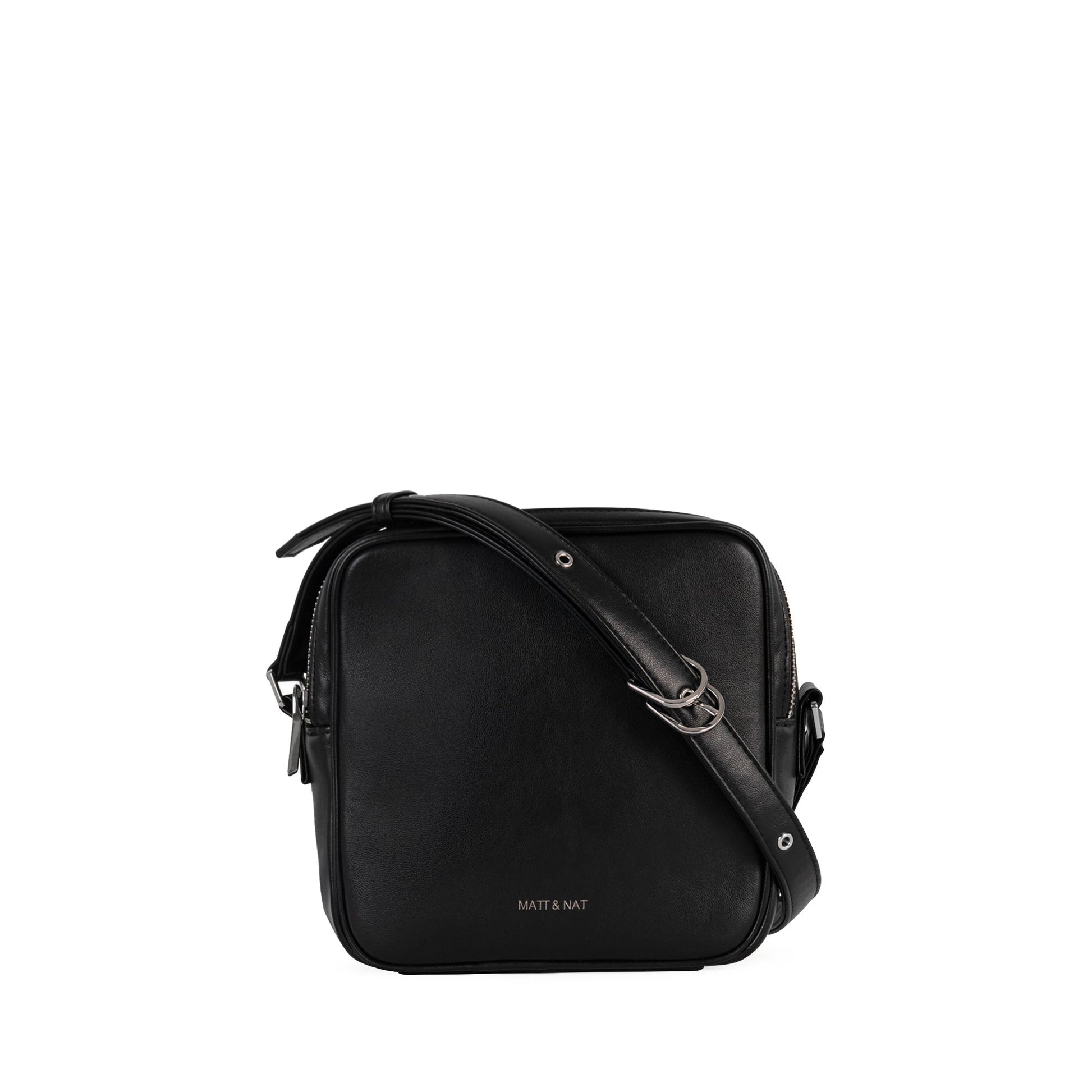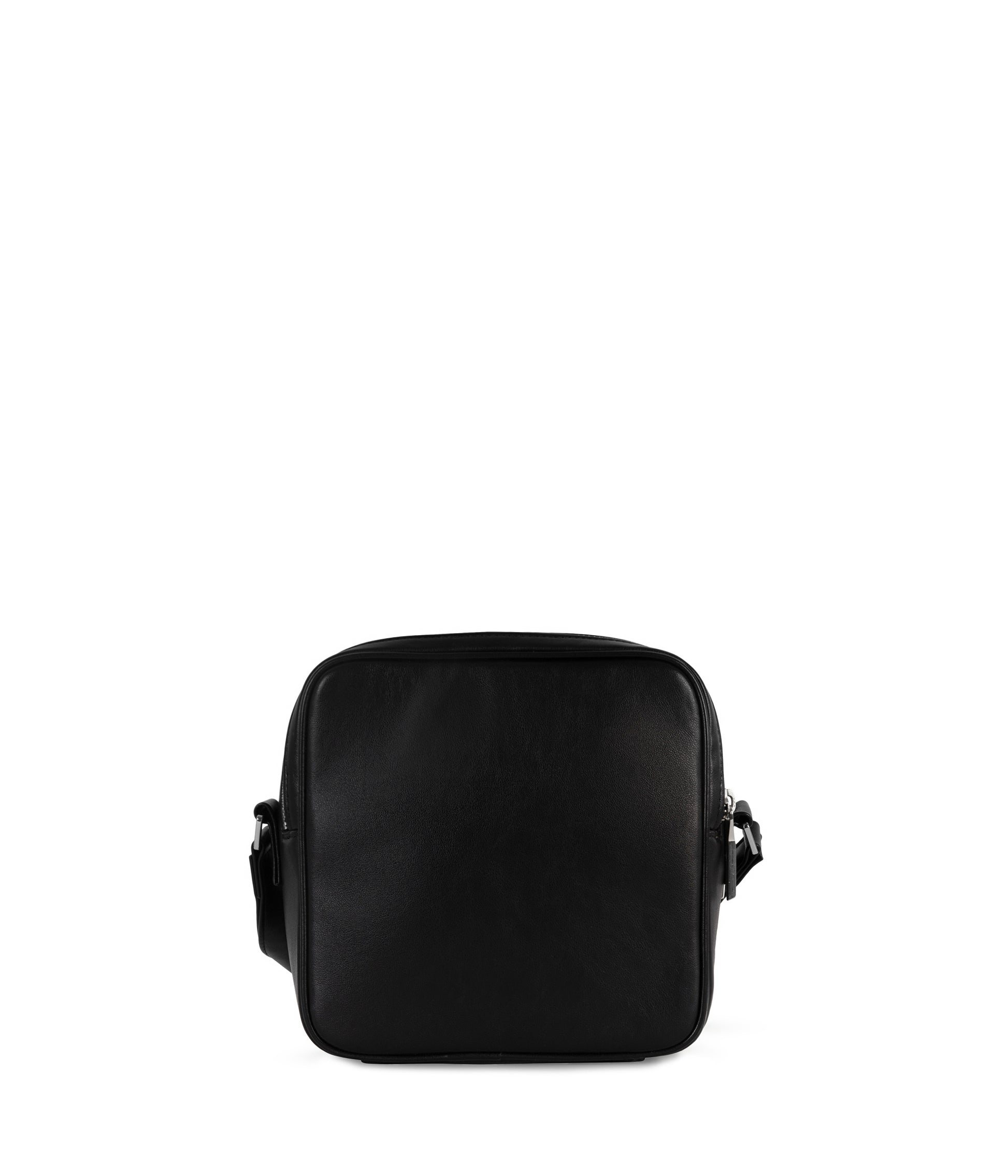 A double-compartment crossbody bag with zippered closures and an adjustable strap.