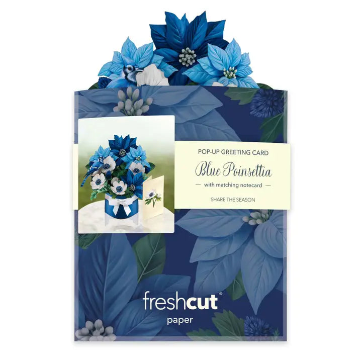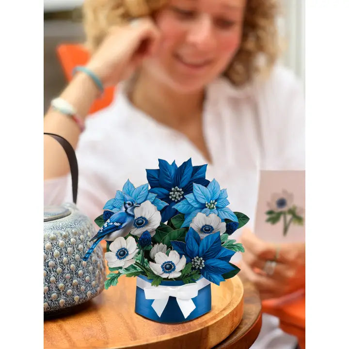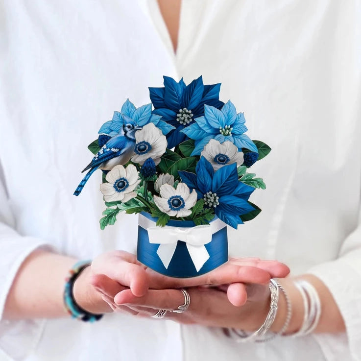 Mini and mighty blue poinsettias burst with life in a wilt-proof pop-up bouquet. This festive expression of chilly cheer includes a cheeky Blue Jay, perched amongst subtle dusty miller leaves, bold blue thistle, and snow-white anemones. Blue Jays symbolize good fortune and protection while poinsettias evoke goodwill and community spirit, so spread the holiday cheer all around with a merry bouquet that will take you through the new year. A textured navy bowl with a frosted satin bow makes this mini bouquet the perfect wintertime gift, no matter the holiday or special recipient.