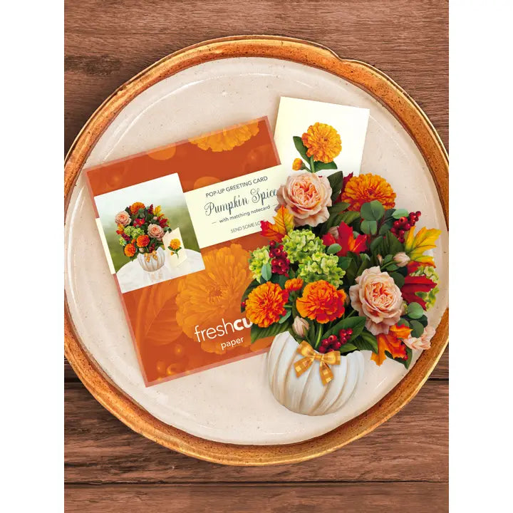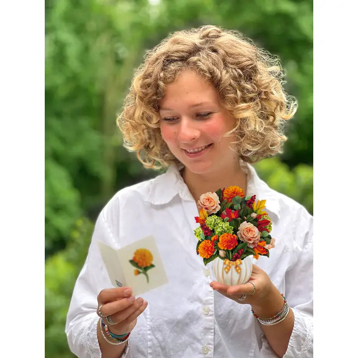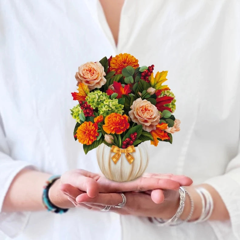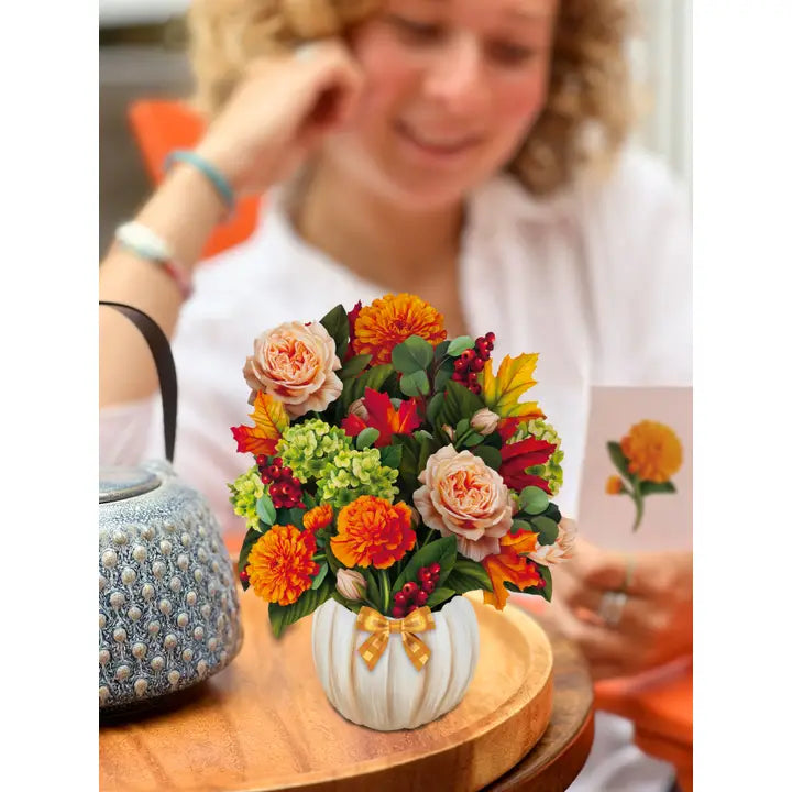 Life is gourd when it's pumpkin spice season! Enjoy the cinnamon shades of fall all year long with the Mini Pumpkin Spice paper bouquet. Mini and meticulously designed marigolds, garden roses, green hydrangeas, eucalyptus, red berries, and maple leaves blossom in a white pumpkin vase with a sweet, gingham bow. Pumpkin spice season is a state of mind with FreshCut Paper’s mini bouquet that never wilts, and always stays in style.