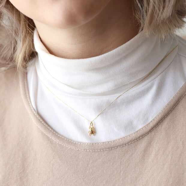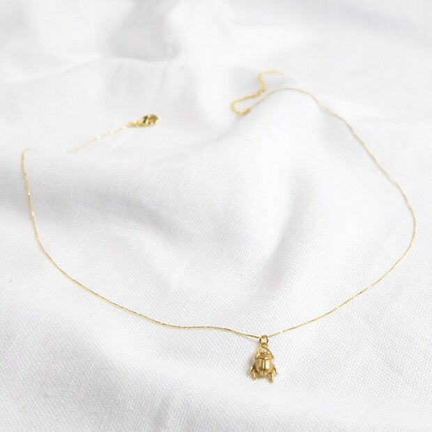 This beautiful bug necklace with a matte gold tiny beetle pendant, is complete with an ultra delicate curb chain that has an easy to use lobster clasp fastening and extender links to secure. This quirky piece of ladies' gold jewelry is the perfect simple accessory for wearing alone or wearing with other necklaces to create an on-trend layered look.