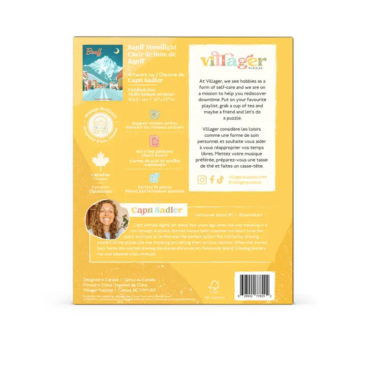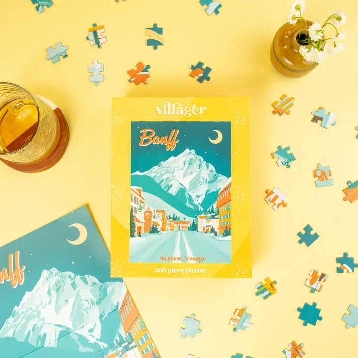 This beautifully-illustrated travel poster style puzzle of Banff, Alberta shows the town and mountains at night. Pairs with winter and outdoors themed decor, prints and gifts. Designed by Canadian artist and nature lover, Capri Sadler. Style is modern retro. Great souvenir to bring home from Canada or gift idea for local shoppers.