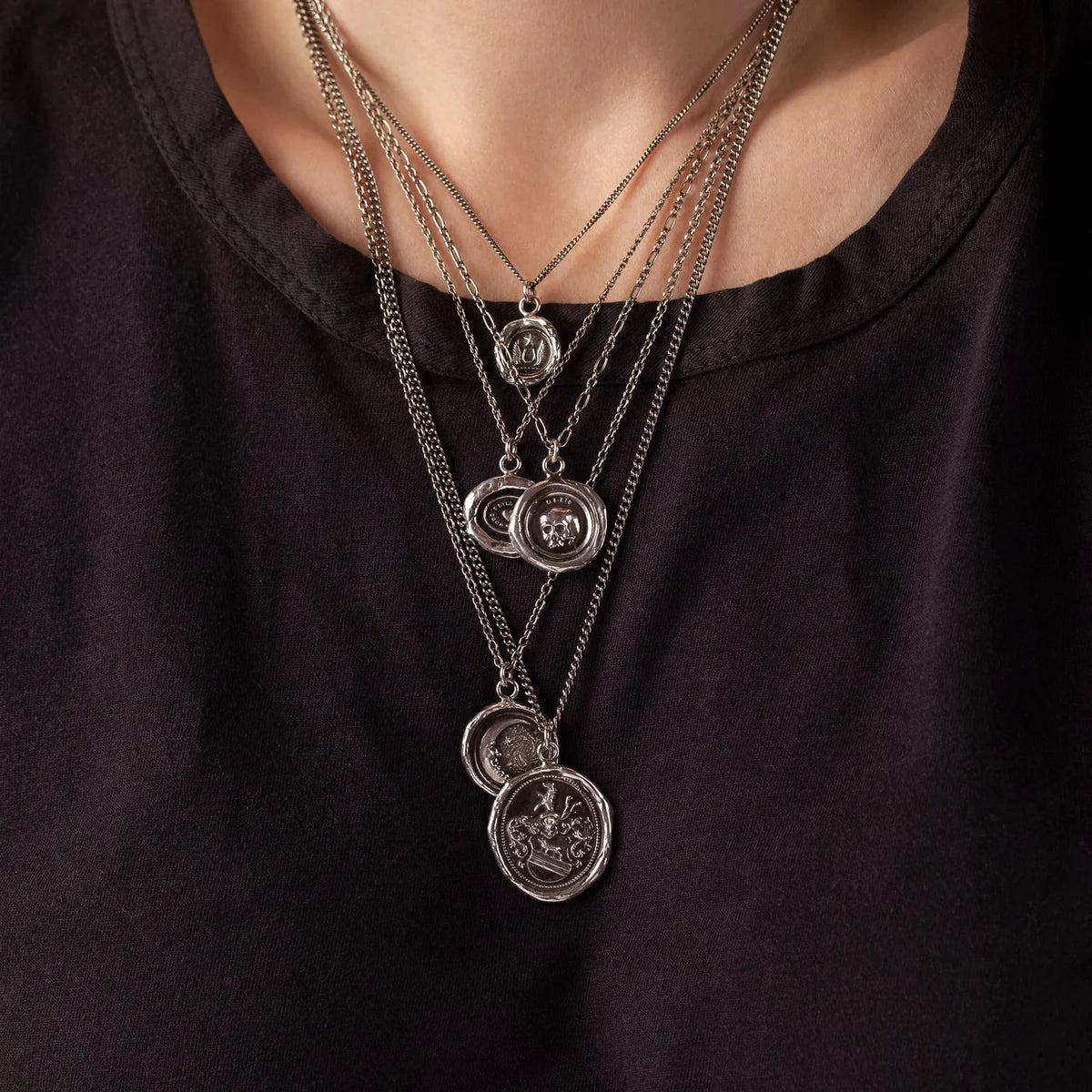 - Sterling silver talisman on an 20" sterling silver curb chain with a Pyrrha branded quality tag.