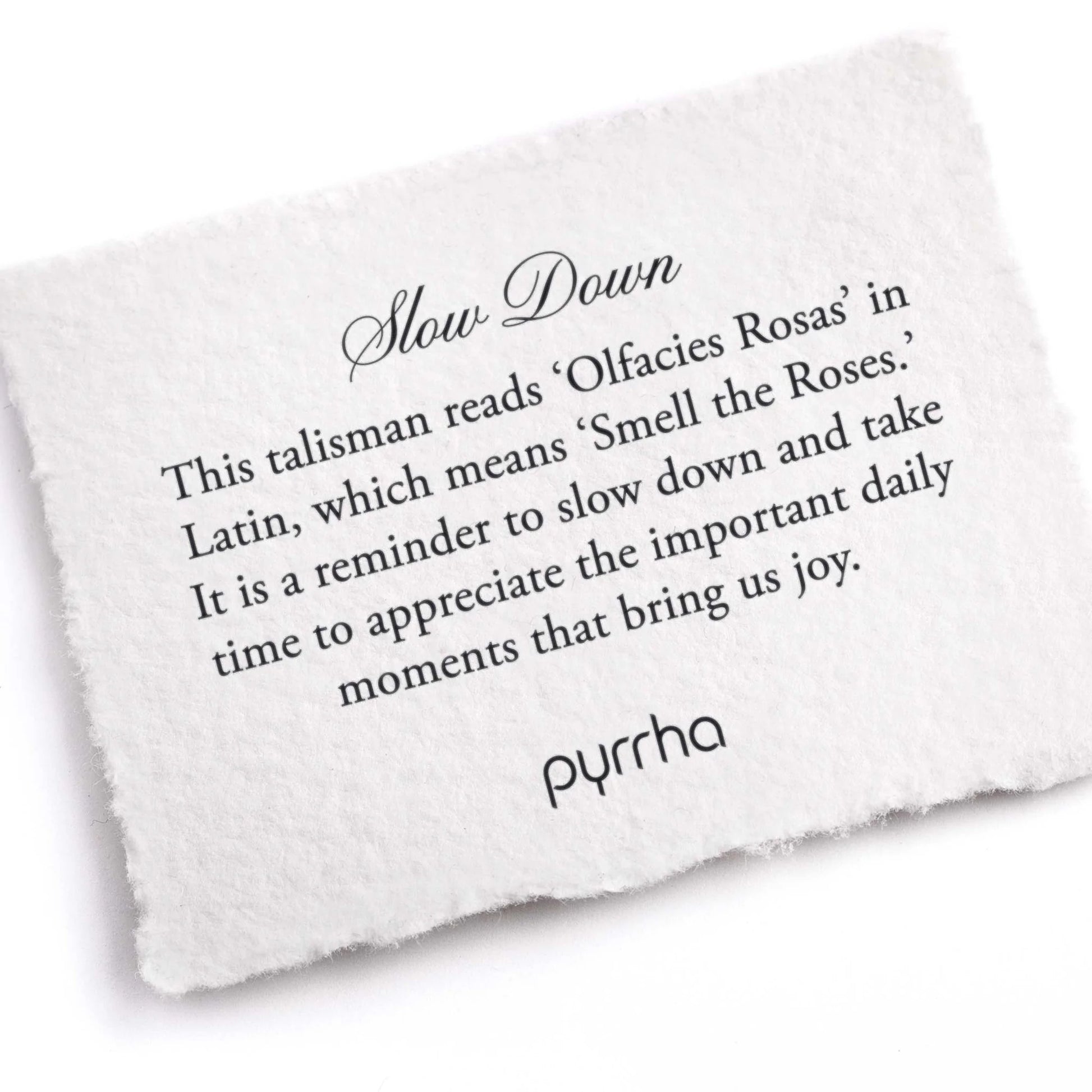 This talisman reads ’Olfacies Rosas’ in Latin, which means ’Smell the Roses’. It is a reminder to slow down and take time to appreciate the important daily moments that bring us joy.