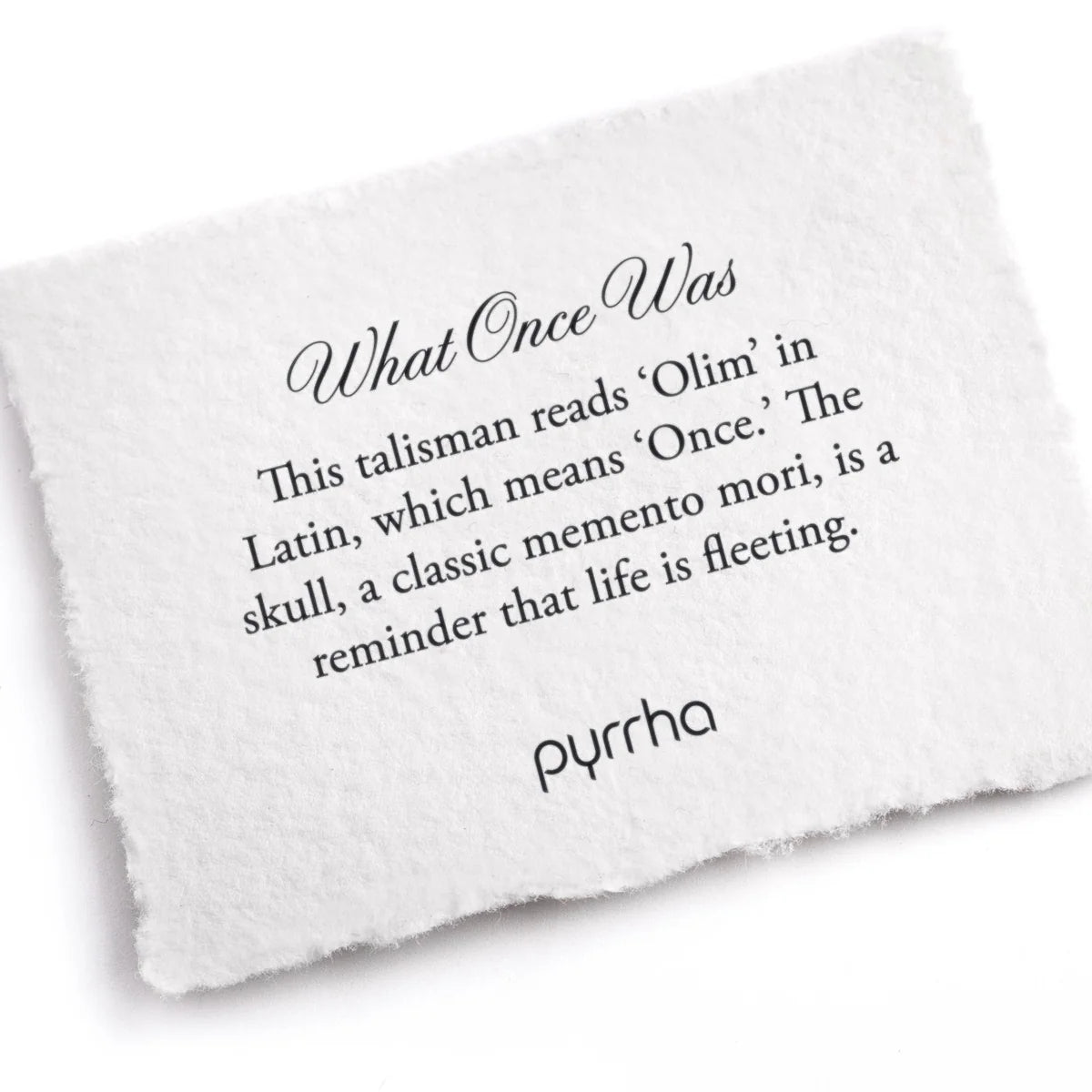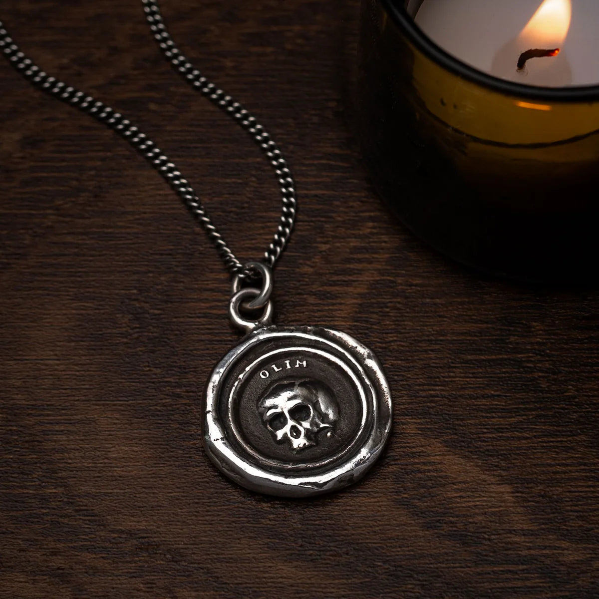 This talisman reads 'Olim' in Latin, which means 'Once.' The skull, a classic memento mori, is a reminder that life is fleeting.