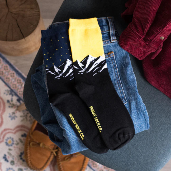 Stars and sunsets are all around us, so why not wear the beauty of the night sky with you every day? These socks feature bright yellow stars and a sunset over a mountain.