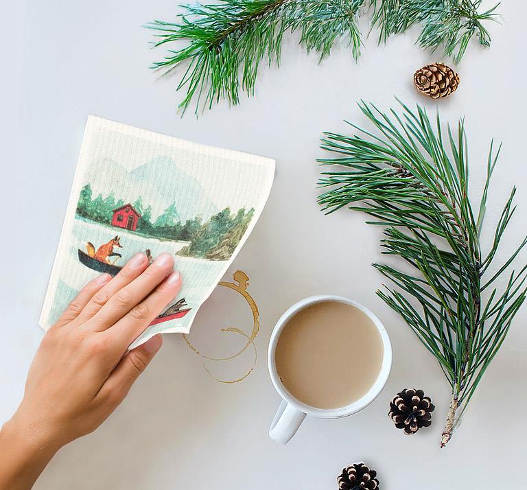 These biodegradable European-made and PRC-printed dishcloths are as durable as they are eco-friendly – featuring animals paddling in a canoe. Our digitally printed dishcloths will help with your washing and cleaning. Ultra-absorbent, each machine-washable cloth replaces up to 15 rolls of paper towel, and lasts for up to 12 months. Perfect for the home, office or cottage. Designed by Victoria Barnes. Exclusive to Abbott.