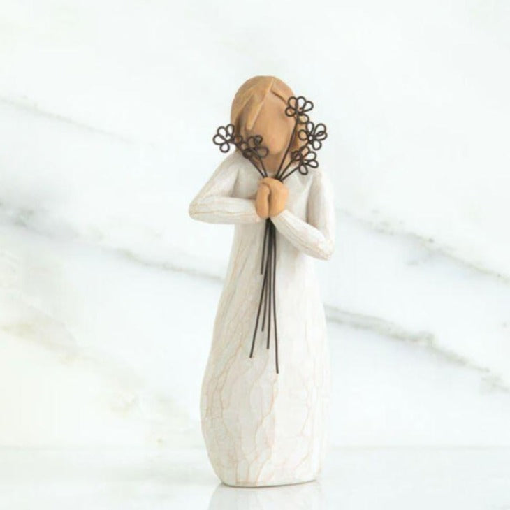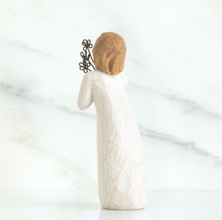 - Standing figure in cream dress holding five wire flowers with long stems in front of her face